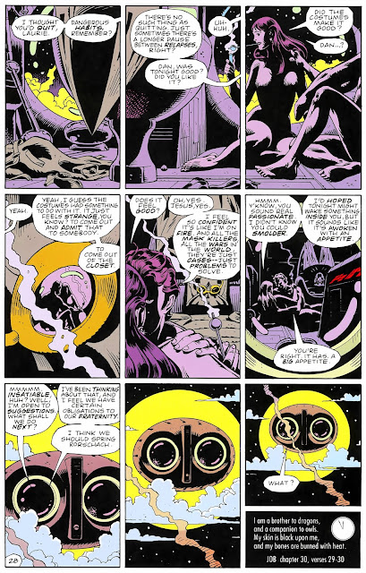 Veja-se a espantosa sequência do sonho erótico de Dan Dreiberg, no Capítulo Sete, em que ele e Julia se despem e arrancam a pele, revelando os uniformes de super-heróis sob a pele, ou seja, o disfarce torna-se a sua verdadeira face. Algo que já era bem evidente em Rorschach, cuja personalidade se sobrepunha claramente à de Walter Kovacks e cujo passado traumático pudemos conhecer melhor no último capítulo do volume anterior.