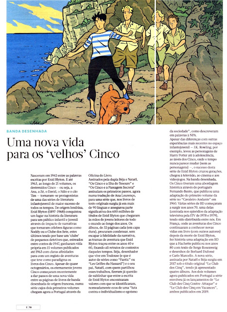 Apesar das diferenças com outras experiências mais recentes no espaço infanto juvenil – J.K. Rowling, por exemplo, levou as personagens de Harry Potter até à adolescência, ao invés dos Cinco, onde o tempo nunca parece mudar (nem as personagens) –, o sucesso desta série de Enid Blyton cruzou gerações, chegou à televisão, ao cinema e aos videojogos. Na banda desenhada, Os Cinco tiveram uma abordagem histórica através do português Fernando Bento, que publicou uma adaptação do primeiro volume da série no “Cavaleiro Andante” em 1960. Várias séries de BD começaram a surgir nos anos 70, uma delas (centrada nos episódios da adaptação televisiva pela ITV de 1978 e 1979), tendo sido distribuída entre nós. Em França, onde as aventuras dos Cinco continuaram a conhecer novas vidas em livro (com outros autores) depois da morte de Enid Blyton, fez história uma adaptação em BD que a Hachette publicou nos anos 80 com texto de Serge Rosenweig e desenhos de Berbard Dufossé e Carlo Marcello. A nova série, assinada por Nataël e Béja surgiu em 2017 sob o título original “Le Club des Cinq”, tendo já apresentado quatro álbuns. Aos dois volumes agora publicados em Portugal a série envolveu já os lançamentos de “Le Club des Cinq Contre-Attaque” e “Le Club des Cinq em Vacances”, ambos publicados em 2019.