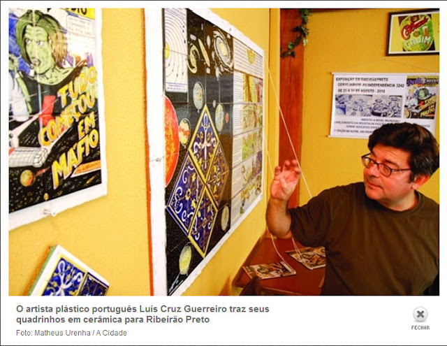 Conheci o Luís Guerreiro graças à Internet, este ímã de maluco. Ele viu o “Hitler no Leblon” do Allan Sieber, fez uns comentários e a gente começou a trocar ideias. Em dezembro passado estive em Portugal e ele me hospedou em seu apartamento em Alhos Vedros, vila medieval feita cidade dormitório de Lisboa. Este ano ele esteve no Rio com Tina, sua mulher, e ficou uns dias aqui em casa. Veio para cá para imprimir o primeiro episódio de “Aventuras de Jerílio no século 25″, história em quadrinhos que está fazendo em azulejos (ele é mestre azulejeiro e paineleiro, com direito a trocadilho, faz favor) que você pode ver em exposição no seu ateliê no vídeo acima e que ele prometeu publicar aqui na “Zé Pereira” tão logo termine de fazer o episódio 2.