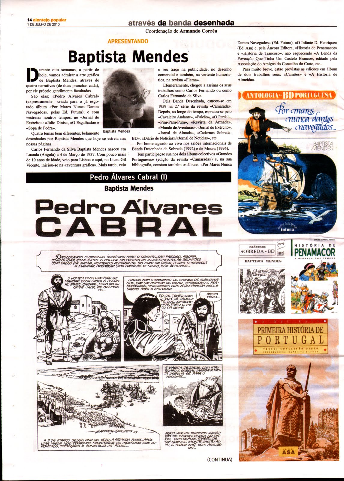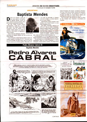 Durante oito semanas a partir de hoje, vamos admirar a arte gráfica de Baptista Mendes, através de quatro narrativas (de duas pranchas cada), por ele próprio gentilmente facultadas.São elas: «Pedro Álvares Cabral» (expressamente criada para o já esgotado álbum «Por Mares Nunca Dantes Navegados», pelas Bd. Futura); e com «estreia» noutros tempos, no «Jornal do Exército»: «Júlio Dinis», «O Esgalhado» e «Sopa de Pedra». Quatro temas bem diferentes, belamente Baptista Mendes desenhados por Baptista Mendes que hoje se estreia nas nossas pâginas.