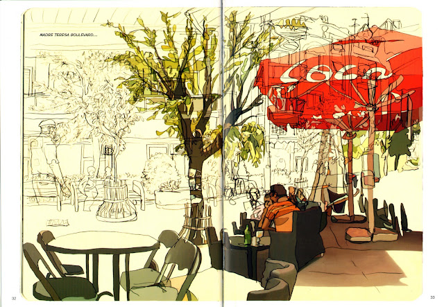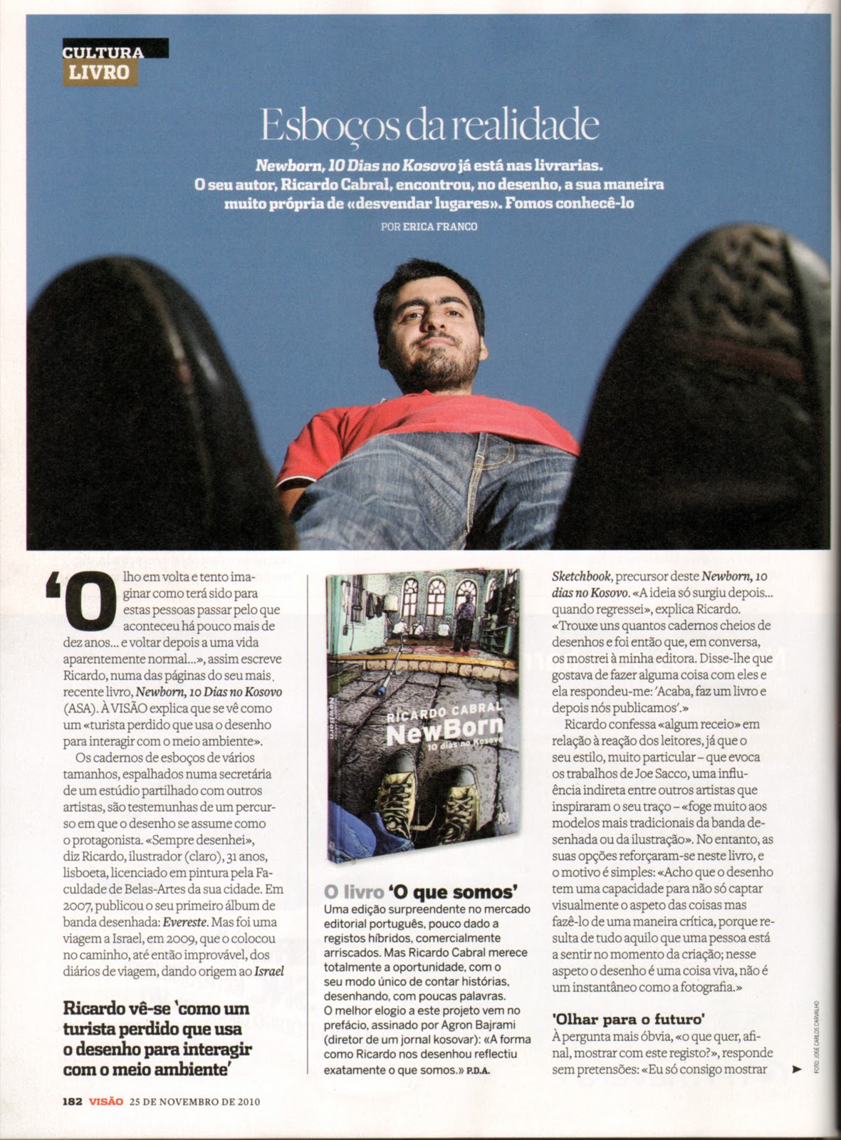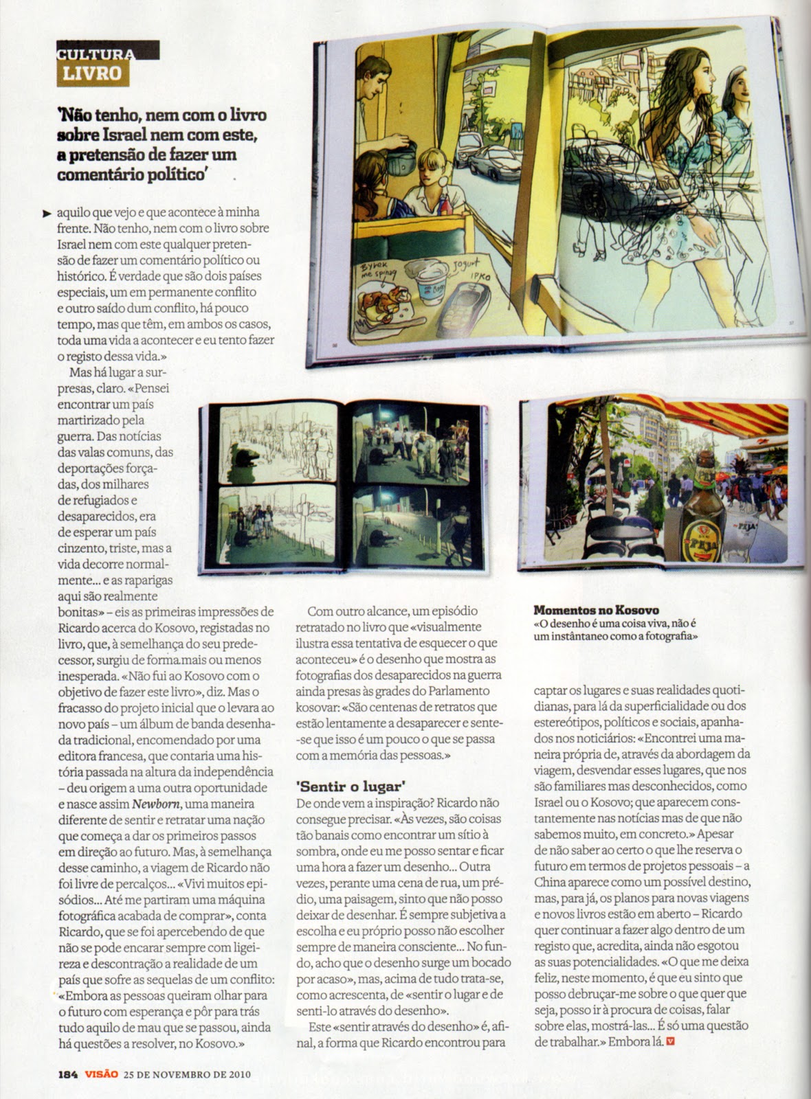 ÀVISÃO explica que se vê como um «turista perdido que usa o desenho para interagir com o meio ambiente». Os cadernos de esboços de vários tamanhos, espalhados numa secretária de um estúdio partilhado com outros artistas [The Lisbon Studio], são testemunhas de um percurso em que o desenho se assume como o protagonista. «Sempre desenhei», diz Ricardo, ilustrador (claro), 31 anos, lisboeta, licenciado em pintura pela Faculdade de Belas-Artes da sua cidade. Em 2007, publicou o seu primeiro álbum de banda desenhada: Evereste. Mas foi uma viagem a Israel, em 2009, que o colocou no caminho, até então improvável, dos diários de viagem, dando origem ao Israel Sketchbook, precursor deste NewBorn., 10 dias no Kosovo. «A ideia só surgiu depois... quando regressei», explica Ricardo.