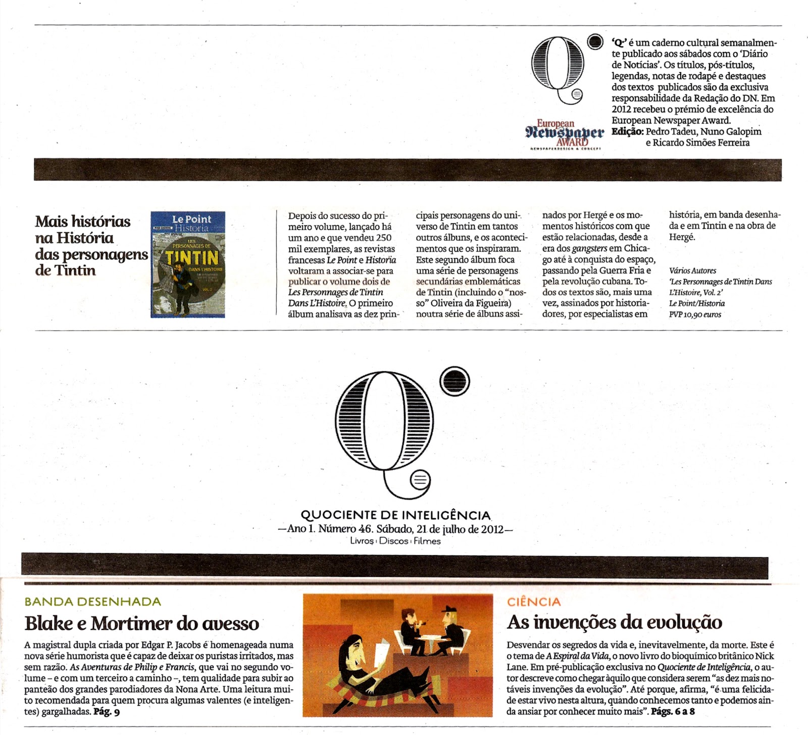 'Q:' é um caderno cultural semanalmente publicado aos sábados com o 'Diário de Noticias'. Os títulos, pós-títulos, legendas, notas de rodapé e destaques dos textos publicados são da exclusiva responsabilidade da Redação do DN. Em 2012 recebeu o prémio de excelência do European Newspaper Award.