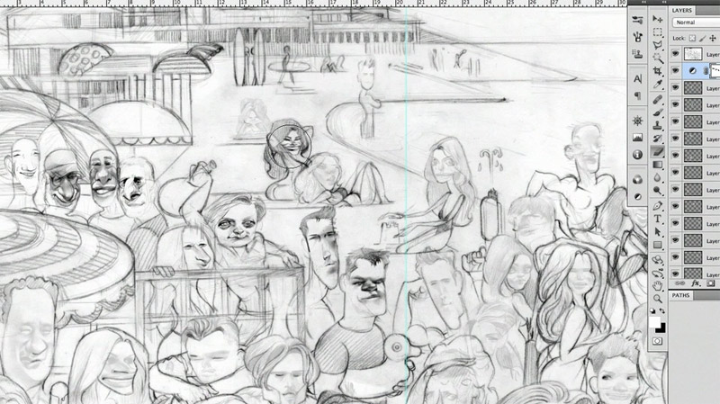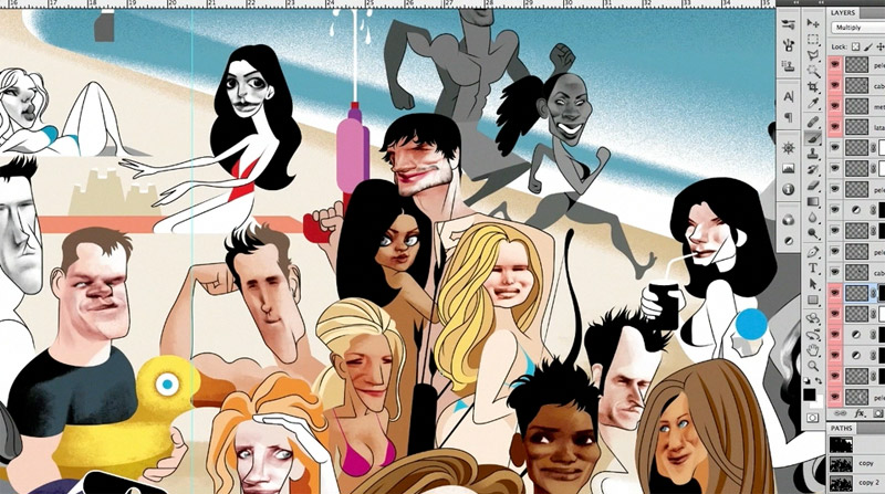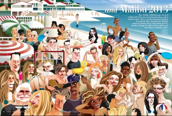 A ilustração agora recriada por André Carrilho, 38 anos, foi concebida originalmente pelo ilustrador Miguel Covarrubias, em 1933, e foi atualizada por Robert Risko em 1995, com as personalidades da altura. A Vanity Fair queria agora um ilustrador que introduzisse este painel no novo milénio, mas sem perder de vista o enquadramento das duas ilustrações anteriores.