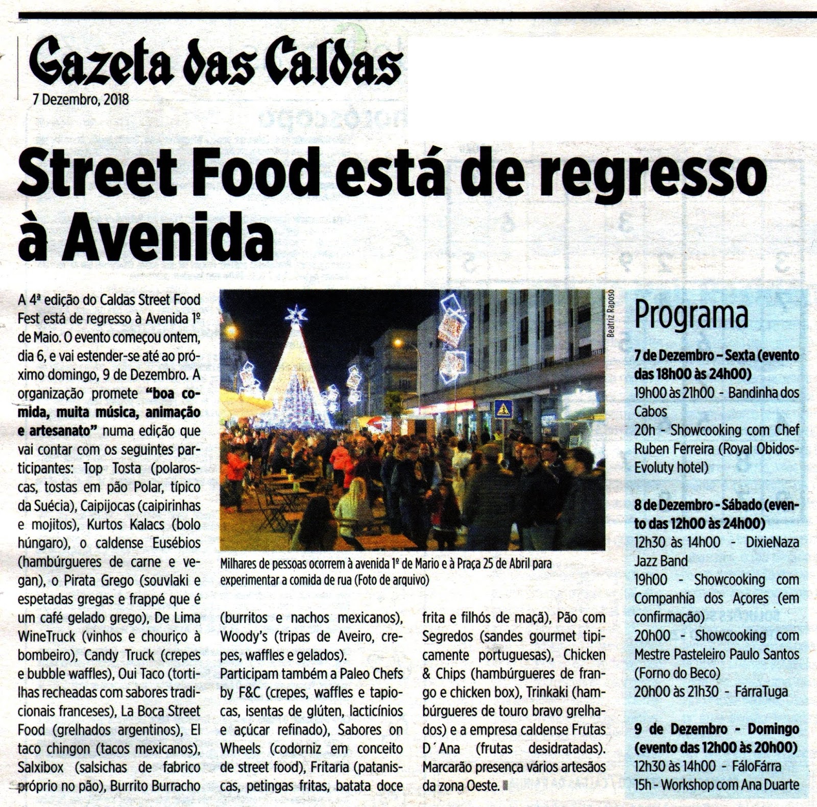 Mais uma edição do Caldas Street Food Fest está de regresso à Avenida 1º de Maio. O evento começou sexta feira, e vai estender-se até domingo, 9 de Dezembro. A organização promete "boa comida, muita música, animação e artesanato" numa edição que vai contar com os seguintes participantes: Top Tosta (polaroscas, tostas em pão Polar, típico da Suécia), Caipijocas (caipirinhas e mojitos), Kurtos Kalacs (bolo húngaro), o caldense Eusébios (hambúrgueres de carne e vegan), o Pirata Grego (souvlaki e espetadas gregas e frappé que é um café gelado grego), De Lima WineTruck (vinhos e chouriço à bombeiro), Candy Truck (crepes e bubble waffles), Oui Taco (tortilhas recheadas com sabores tradicionais franceses), La Boca Street Food (grelhados argentinos), El taco chingon (tacos mexicanos), Salxibox (salsichas de fabrico próprio no pão), Burrito Burracho, (burritos e nachos mexicanos), Woody's (tripas de Aveiro, crepes, waffles e gelados).